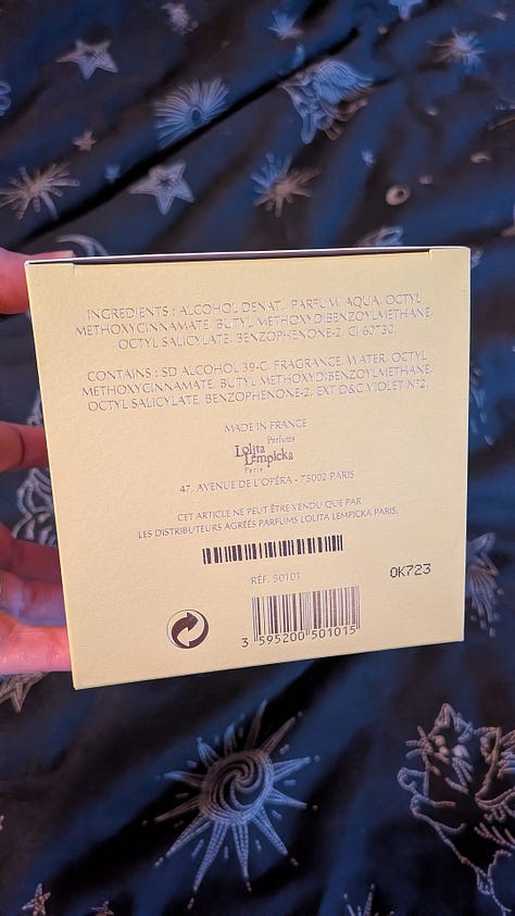 Here, I will present my findings, with some very obscure, old website links to explain my hypotheses. I cannot guarantee my presentation’s accuracy. I cannot ensure your faith in me. But if you’re trying to find the original Lolita Lempicka EDP, perhaps my final purchase may sway you.