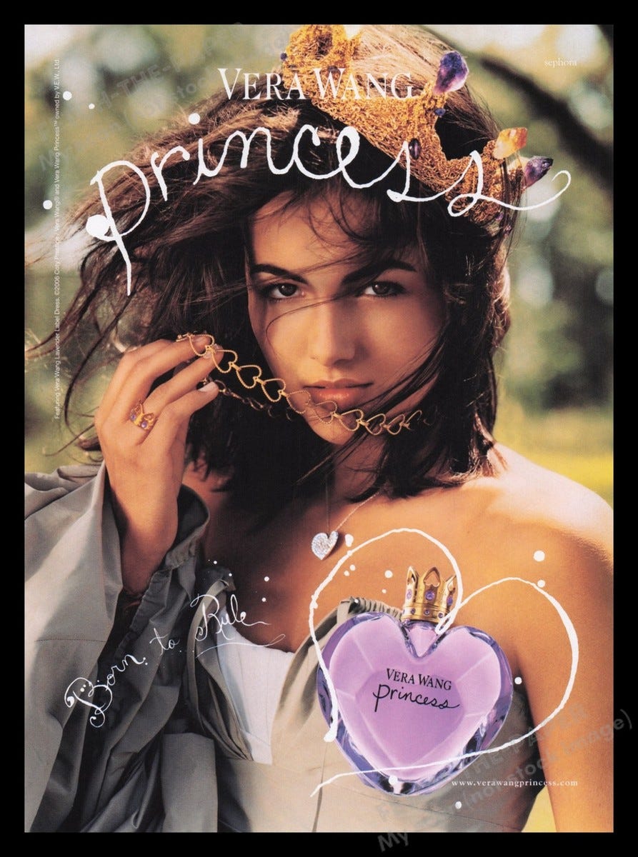 My first “real” perfume was Vera Wang Princess. I remember seeing the news of its release on Now Smell This and losing my mind. The name! The heart-shaped glass! The cap with adorned by wearable gold rings! I had to have it.1