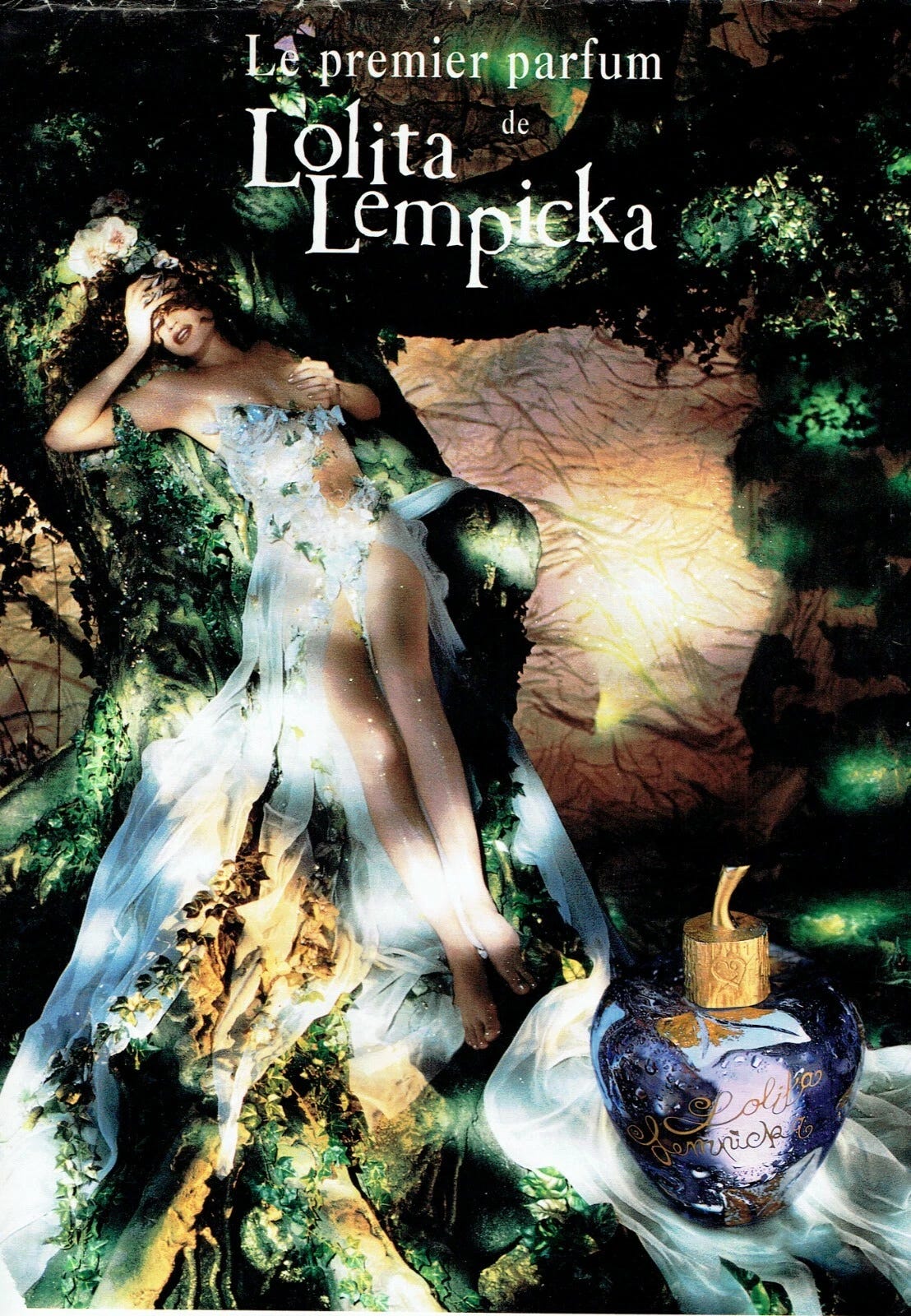 The cute bottle caught my attention, and unlike a lot of perfumes of the 2000s, the scent truly looked like it belonged in its bottle—and its ads. With notes of ivy, violet, tonka, and a lot of star anise2, Lolita Lempicka smells like a sheer-winged, powdery fairy in an ivy-covered tree, or a cheeky forest maiden in a gossamer gown who has to leave the ball by midnight.