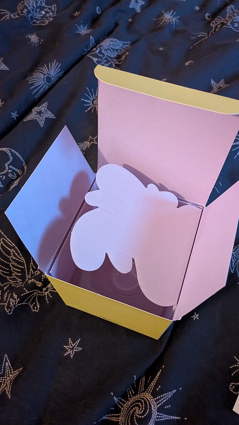 And after I click “buy,” I realized… I had no idea what I was getting. The box still being in its original cellophane seemed like the ideal purchase—No degradation from the sun, etcetera—but I started second guessing myself. Maybe it would be one of the angular bottles, or something differently entirely? Oh god, maybe it would be empty????